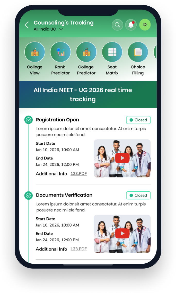 NEET UG PredictorAccess accurate MD/MS college predictions tailored to your NEET PG rank and category. Analyze state-wise counselling data, seat matrix, and quota details. Monitor round-wise cutoff changes across multiple counselling rounds. Plan a smarter PG counselling strategy with clear and realistic options.